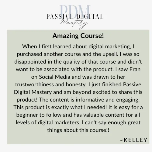 Over the last year I have been focusing on being a mama and working on some new things about what I want to do next in this online space. I am THRILLED to have now found the world of digital products! With master resell rights (selling a done for you digital marketing course) I have been able to make a full time income from my kitchen counter and during nap time. PASSIVE DIGITAL MASTERY will teach you how to create and sell your own digital product. But you can also resell this course without having to change or create a thing and keep 100% of the profit!